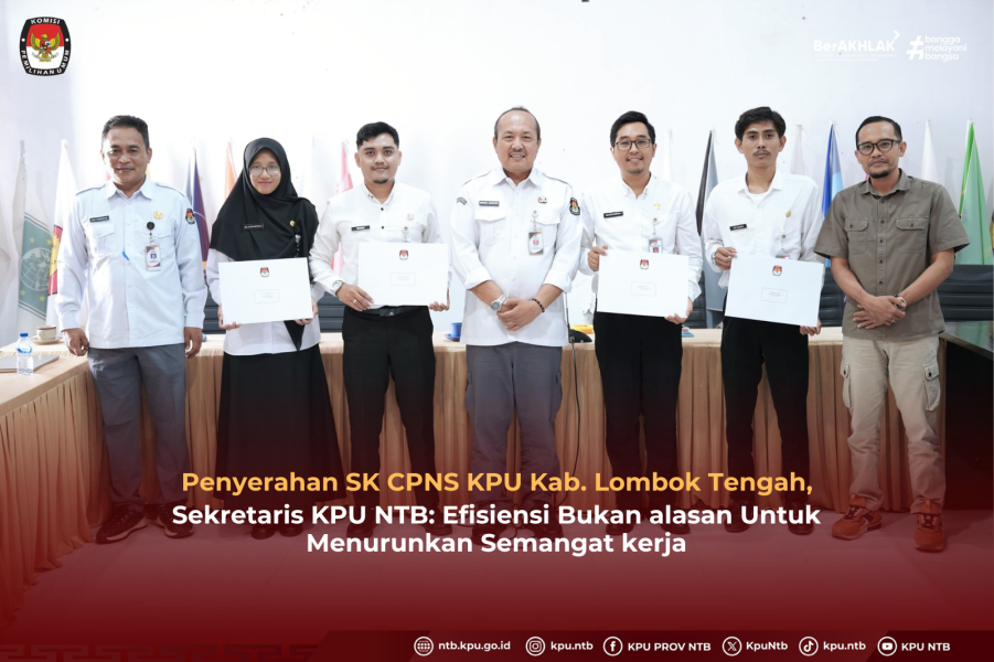 Sekretaris KPU Provinsi Nusa Tenggara Barat menyerahkan Surat Keputusan (SK) Pengangkatan Calon Pegawai Negeri Sipil (CPNS) kepada formasi CPNS KPU Kabupaten Lombok Tengah, Senin (30/6) di Praya. Dalam arahannya, Sekretaris KPU Provinsi NTB Mars Ansori Wijaya, menegaskan bahwa efisiensi tidak boleh menjadi alasan menurunnya semangat kerja.