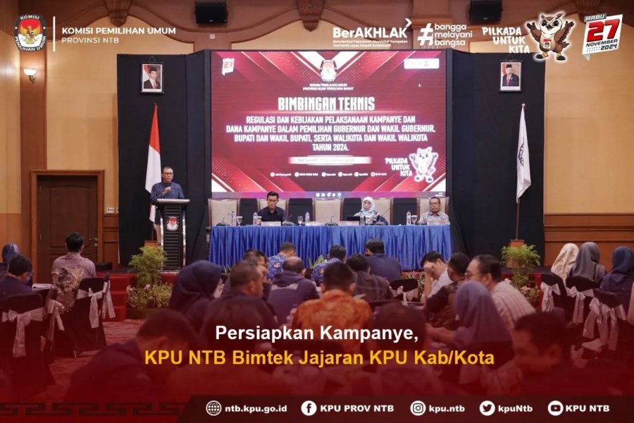 Guna mempersiapkan tahapan pelaksanaan kampanye Pilkada 2024, KPU NTB menggelar bimbingan teknis (Bimtek) kepada jajaran KPU Kabupaten/Kota se NTB pada 17-18 September. Pada Bimtek tersebut mengulas regulasi dan kebijakan pelaksanaan kampanye serta dana kampanye untuk Pemilihan Kepala Daerah 2024.