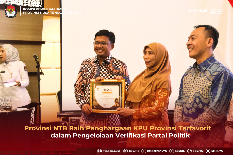 KPU Provinsi NTB meraih penghargaan sebagai KPU Provinsi Terfavorit pada Pengelolaan Tahapan Verifikasi Partai Politik dalam kegiatan Berbagi Pengalaman Tahapan Teknis Pemilu dan Pemilihan Tahun 2024. Penghargaan diterima oleh Kadiv Teknis Penyelenggaraan KPU NTB Zuriati yang sedang mengikuti kegiatan Rakor di Bali dari tanggal 30 Juli sampai dengan 1 Agustus 2024.