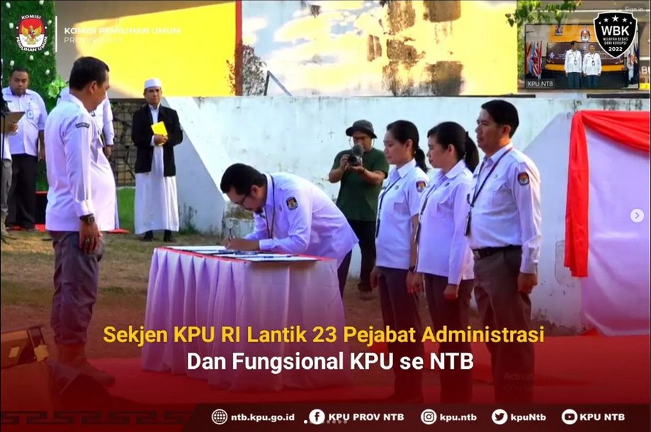 Sekretaris Jenderal KPU Republik Indonesia Bernad Dermawan Sutrisno melantik 23 Pejabat Administrasi Eselon tiga dan empat serta Pejabat Fungsional lingkup KPU Provinsi dan KPU Kabupaten/Kota se NTB, Kamis (21/9) secara Luring dan Daring
