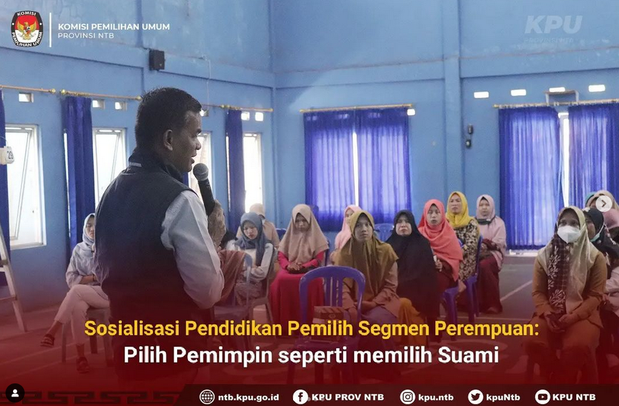 KPU Provinsi NTB laksanakan Sosialisasi Pendidikan Pemilih Pemilu Tahun 2024 Segmen Perempuan bertempat di kantor desa Lembah Sari, Senin (13/9). Dalam paparannya Ketua KPU Provinsi NTB Suhardi Soud mengatakan "memilih Pemimpin itu ibarat memilih calon suami bagi perempuan, kita harus melihat rekam jejak, visi, misi dan programnya”.