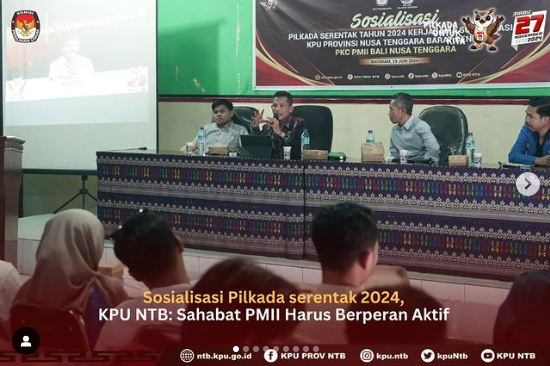KPU Provinsi NTB melaksanakan sosialisasi Pilkada serentak 2024 dengan melibatkan mahasiswa yang tergabung dalam PKC PMII Bali Nusra, Sabtu (29/6) di Mataram. Hadir Ketua Divisi Hukum dan Pengawasan KPU Provinsi NTB Mastur. “Saya meminta kepada seluruh sahabat PMII Bali Nusra untuk berperan aktif entah sebagai penyelenggara, tim calon paslon maupun menjadi Pemilih pada Pilkada 2024 ini”.