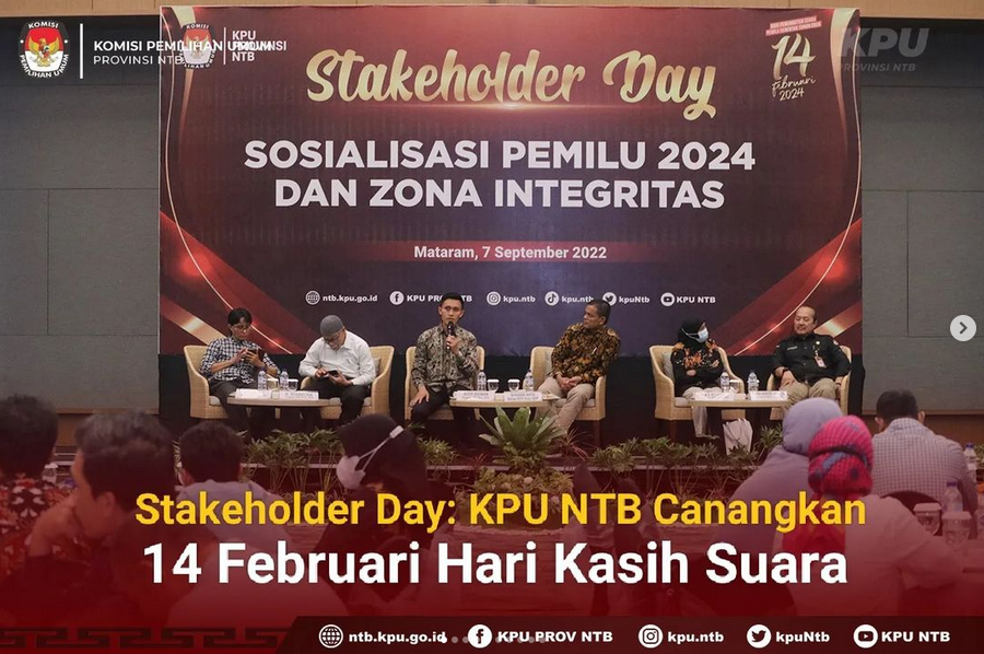KPU NTB adakan "stakeholder day" Sosialisasi Tahapan Pemilu 2024 dan Zona Integritas. "Mari kita jadikan 14 Februari 2024 sebagai Hari Kasih Suara, dimana pada hari itu kita tiadakan kebencian karena perbedaan pilihan" papar Agus Hilman Ketua Divisi Sosdiklih Parmas dan SDM
