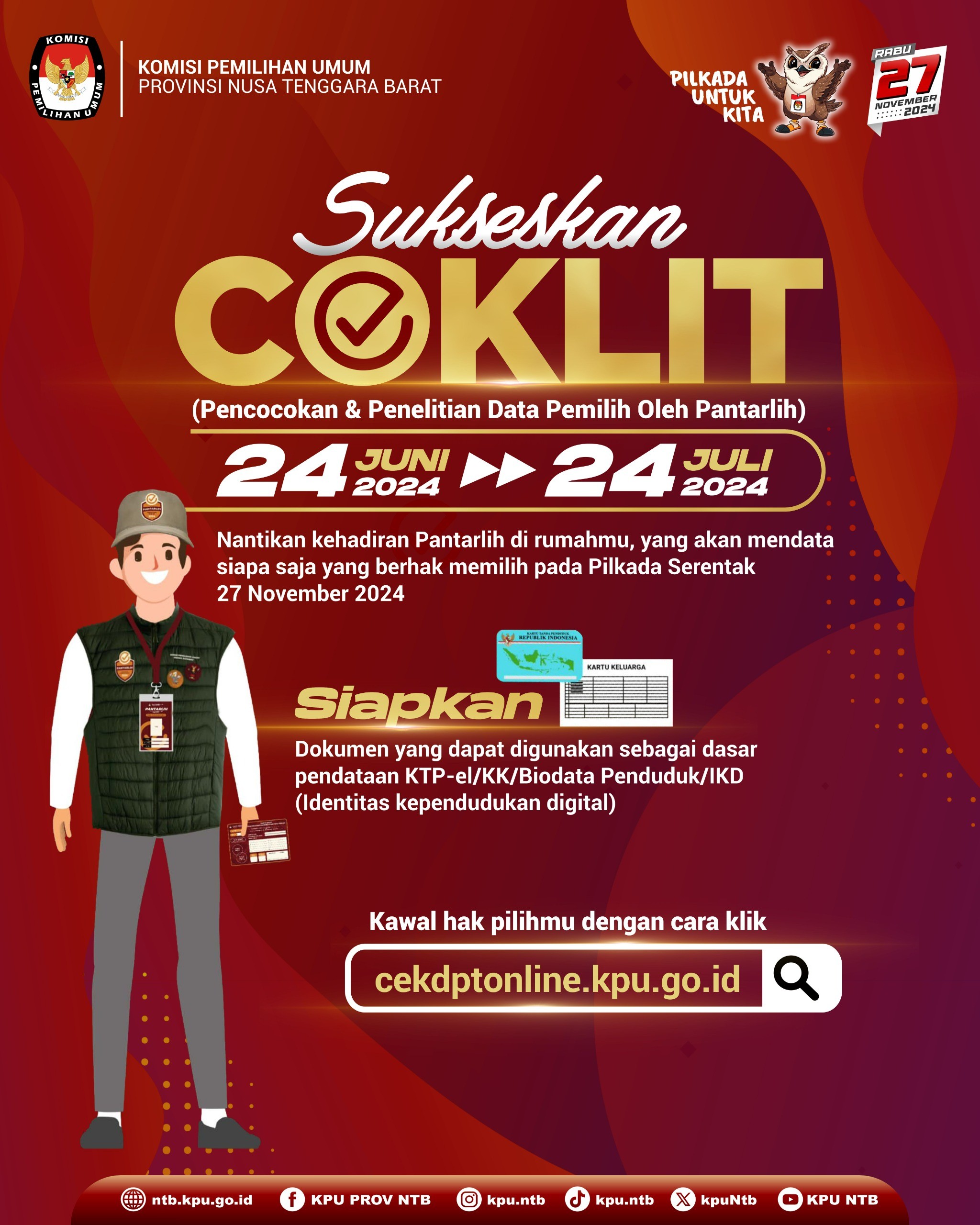 Sukseskan Coklit tanggal 24 Juni 2024 hingga 24 Juli 2024. Nantikan kehadiran Pantarlih di rumahmu untuk mendata siapa yang berhak memilih pada Pilkada Serentak 2024 tanggal 27 November 2024