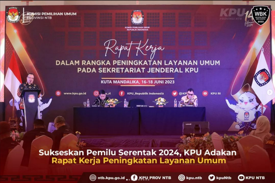 Dalam rangka Peningkatan Layanan Umum pada Sekretariat KPU, KPU RI adakan Rapat Kerja untuk memastikan kesiapan sarana dan prasarana dalam menghadapi Pemilu dan Pemilihan Serentak Tahun 2024, Jumat s.d Minggu (16-18 Juni) di Kuta Mandalika, NTB.