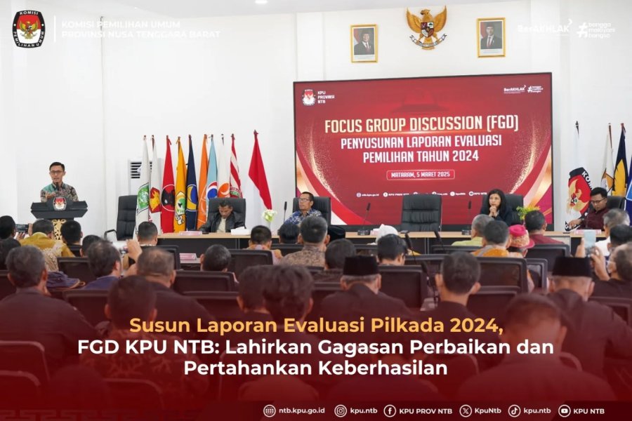 Dalam rangka menyusun Laporan Evaluasi Pemilihan (Pilkada) Tahun 2024, KPU Provinsi NTB menyelenggarakan Focus Group Discussion (FGD) Rabu (5/3) di Mataram. FGD ini menjadi pamungkas dari semua tahapan Pilkada di tahun 2024 lalu. Melalui FGD ini dapat melahirkan gagasan-gagasan perbaikan yang bersifat evalutif terhadap pelaksanaan Pemilu 2024 termasuk Pilkada Serentak 2024 di NTB, ujar Plh Ketua Provinsi NTB Agus Hilman