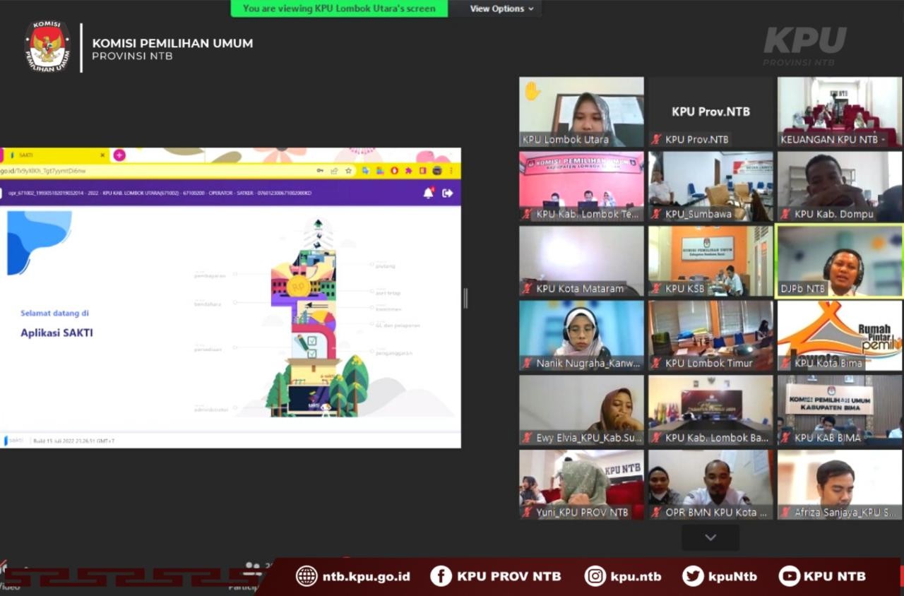 KPU Provinsi NTB kembali melaksanakan kegiatan penyusunan laporan keuangan Semester I Tahun 2022 dengan KPU Kabupaten/Kota se-NTB, Senin (19/7). Proses penyusunan laporan keuangan di tahun 2022 sudah menggunakan Aplikasi SAKTI (Sistem Aplikasi Keuangan Tingkat Instansi).