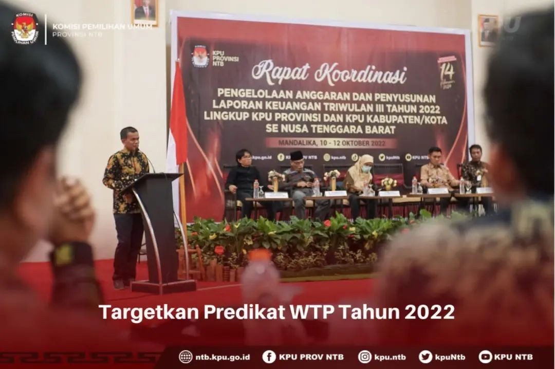 #TemanPemilih Guna meningkatkan Kualitas Laporan Keuangan, serta Akselerasi penyerapan anggaran Tahun 2022, KPU Provinsi NTB menargetkan predikat WTP tahun 2022. Hal ini disampaikan Ketua KPU Provinsi NTB Suhardi Soud pada Kegiatan Rakor Pengelolaan Anggaran dan Penyusunan Laporan Keuangan Triwulan III Tahun 2022 Lingkup KPU Provinsi dan KPU Kabupaten/Kota se NTB 10 s.d 12 Oktober 2022 bertempat di Mandalika.