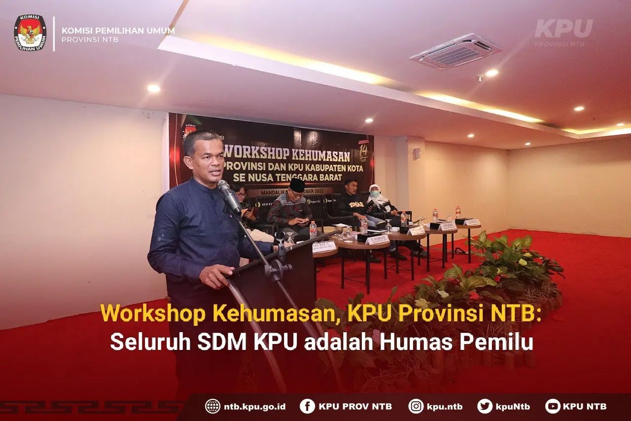 KPU Provinsi NTB mengadakan Workshop Kehumasan dengan peserta KPU Kabupaten/Kota se NTB, Selasa (11/10) di Mandalika, Lombok Tengah. Ketua KPU Provinsi NTB Suhardi Soud mengatakan bahwa seluruh Sumber Daya Manusia (SDM) KPU adalah humas Pemilu.