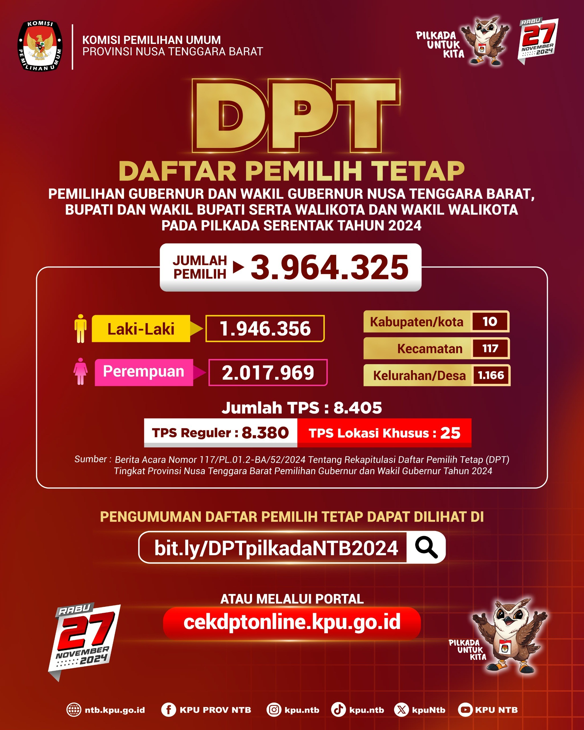 PENGUMUMAN DAFTAR PEMILIH TETAP (DPT) PEMILIHAN GUBERNUR DAN WAKIL GUBERNUR TINGKAT PROVINSI NTB TAHUN 2024