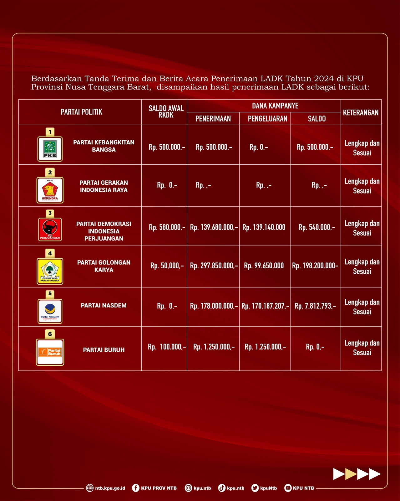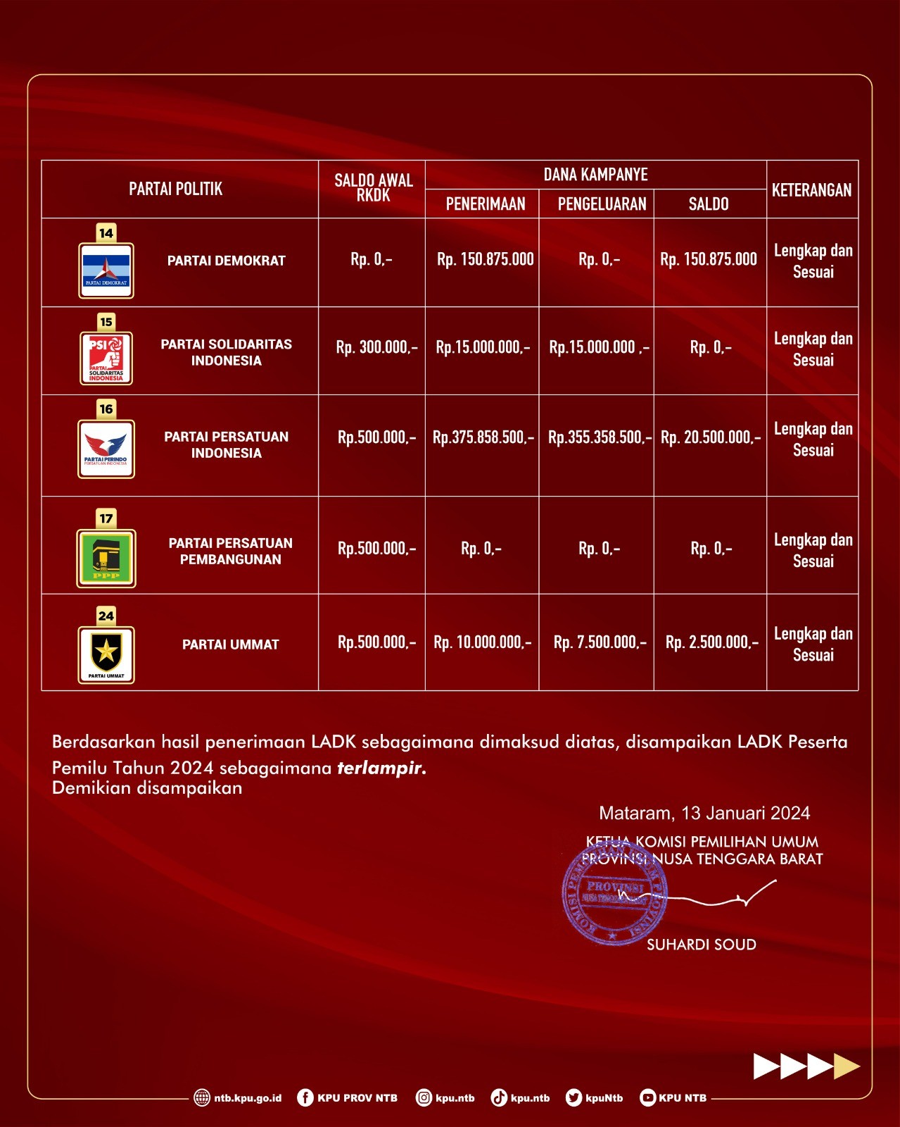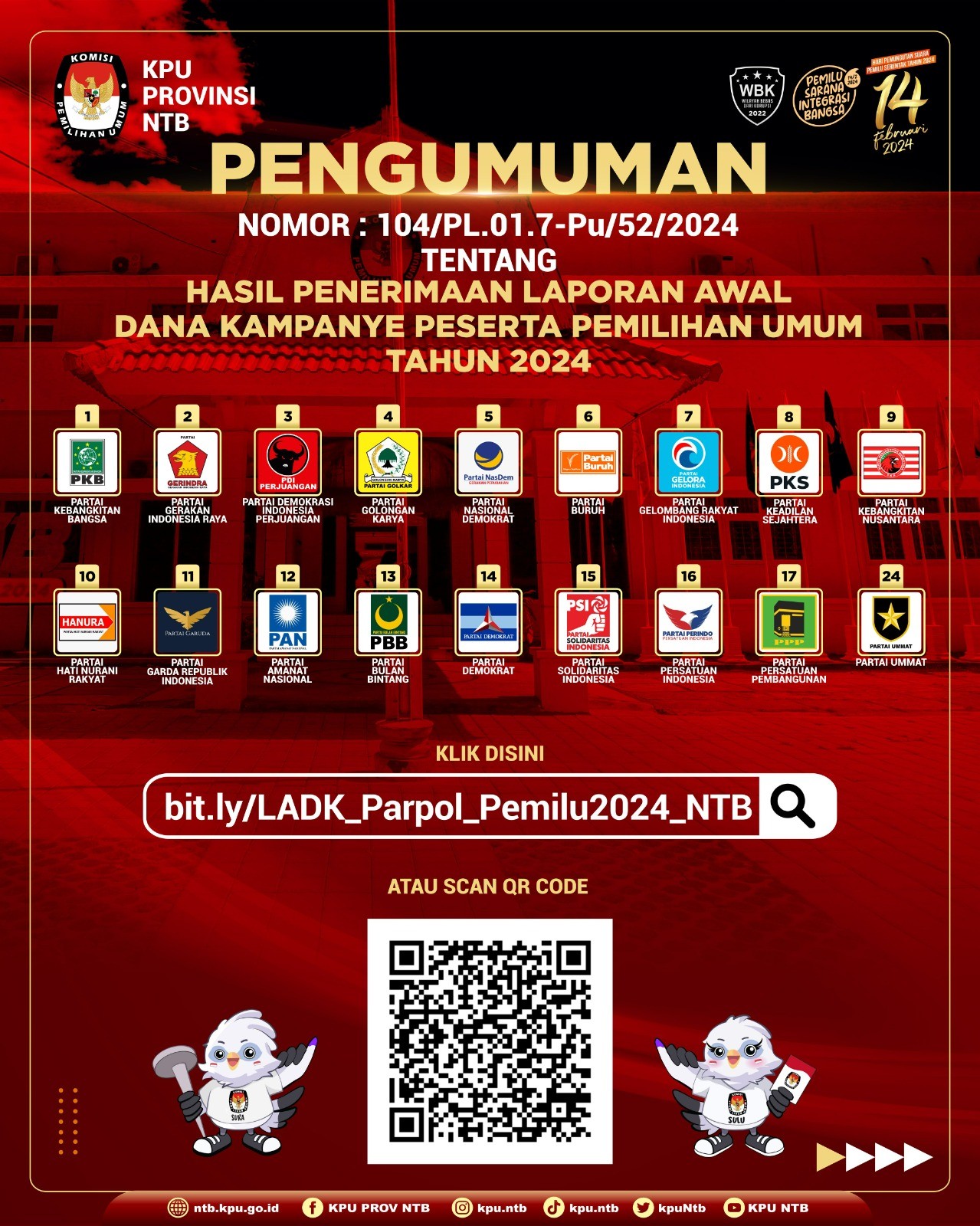 Pengumuman Nomor : 104/PL.01.7-Pu/52/2024 Tentang Hasil Penerimaan Laporan Awal Dana Kampanye Peserta Pemilihan Umum 2024